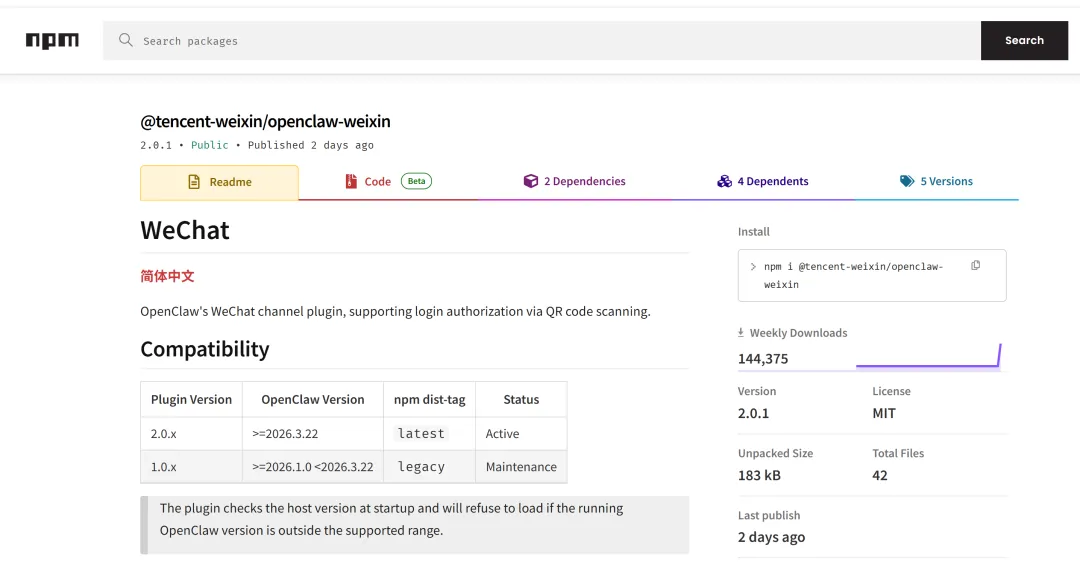 npm上的微信clawbot插件已经更新发布,截图如下: