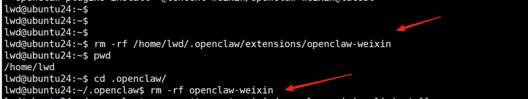建议大家先清理掉旧版插件残留,再通过最新命令重新安装,最后重启网关即可完成升级。删除旧版本插件主要有两个目录: