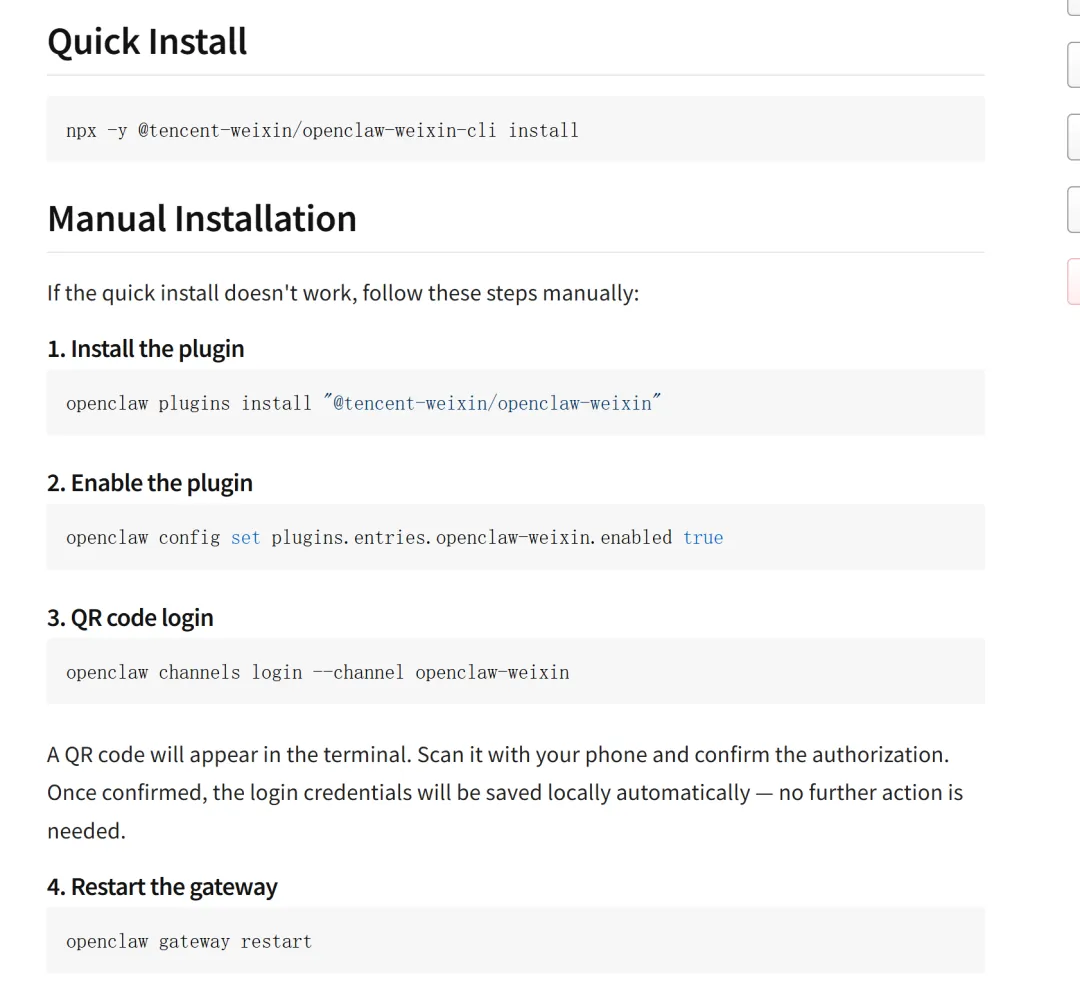 Quick Installnpx -y @tencent-weixin/openclaw-weixin-cli installManual InstallationIf the quick install doesn't work, follow these steps manually:1. Install the pluginopenclaw plugins install "@tencent-weixin/openclaw-weixin"2. Enable the pluginopenclaw config set plugins.entries.openclaw-weixin.enabled true3. QR code loginopenclaw channels login --channel openclaw-weixinA QR code will appear in the terminal. Scan it with your phone and confirm the authorization. Once confirmed, the login credentials will be saved locally automatically — no further action is needed.4. Restart the gatewayopenclaw gateway restart