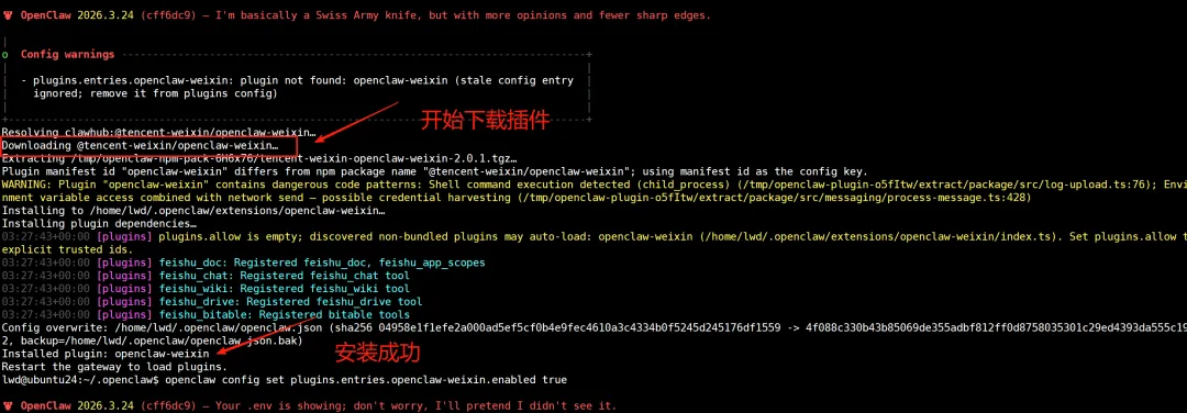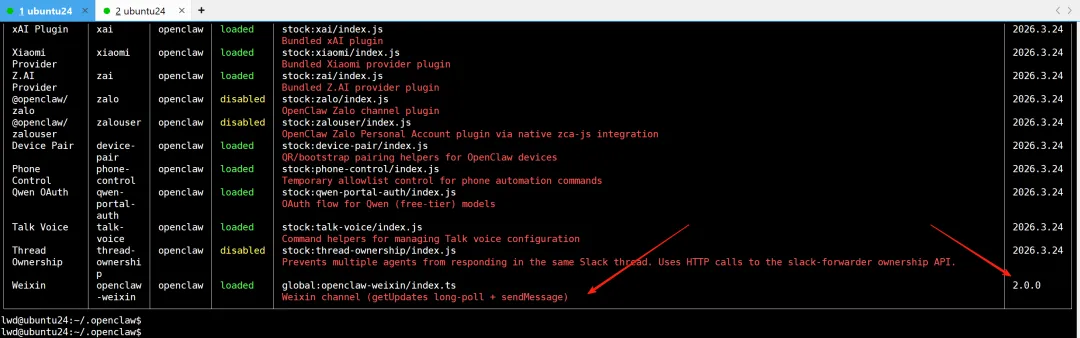 openclaw 这两天发布了新版本,升级到OpenClaw 2026.3.24 (cff6dc9)版本后,旧版本的微信clawbot插件(1.0.3)不能兼容,所以需要将微信插件升级到2.0.1版本才能正常使用。