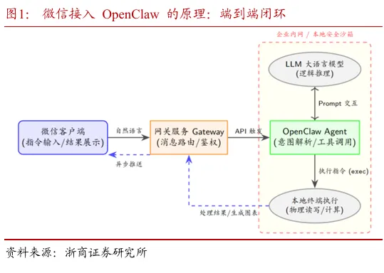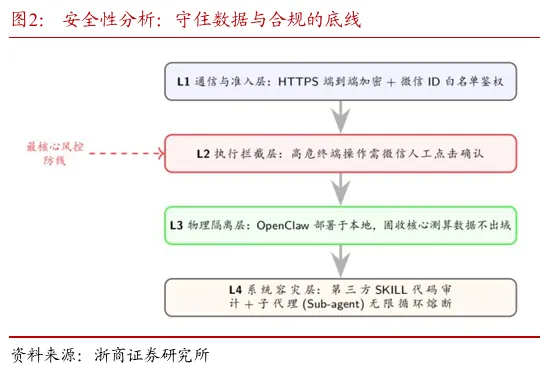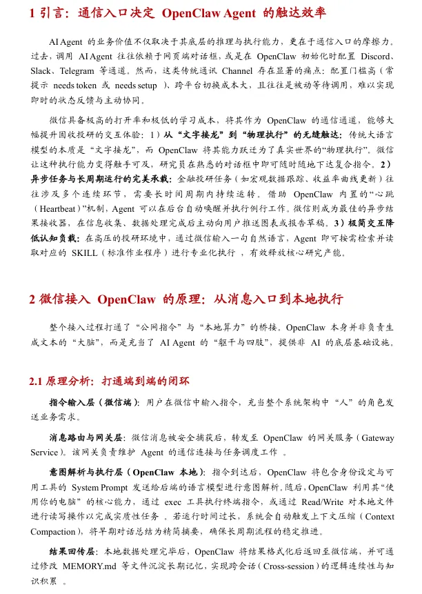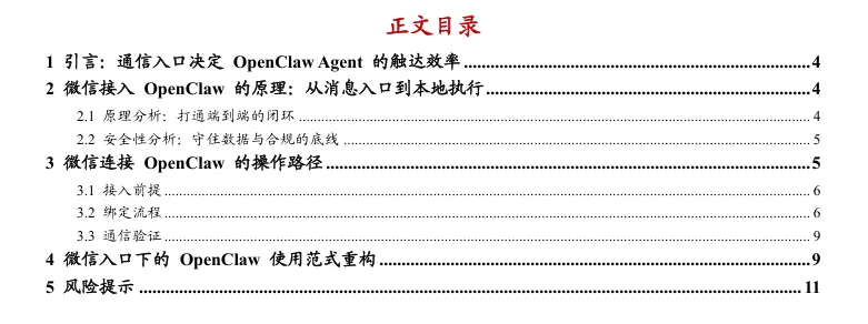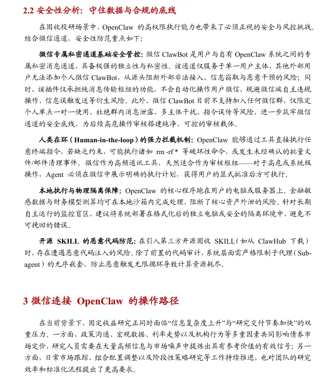 摘要:本报告提出基于微信生态的OpenClaw应用范式。通过微信低门槛入口打通公网指令与本地算力,实现自然语言指令触发本地执行、结果异步回传,大幅提升固收投研交互效率。报告构建私密通道、人在环审批、本地沙箱、代理限制四层安全体系,重构高频信息即时化、碎片化任务、人机协同三大投研场景,推动投研从人力串行向人机并行转型,同时提示权限、数据、合规等七类风险。