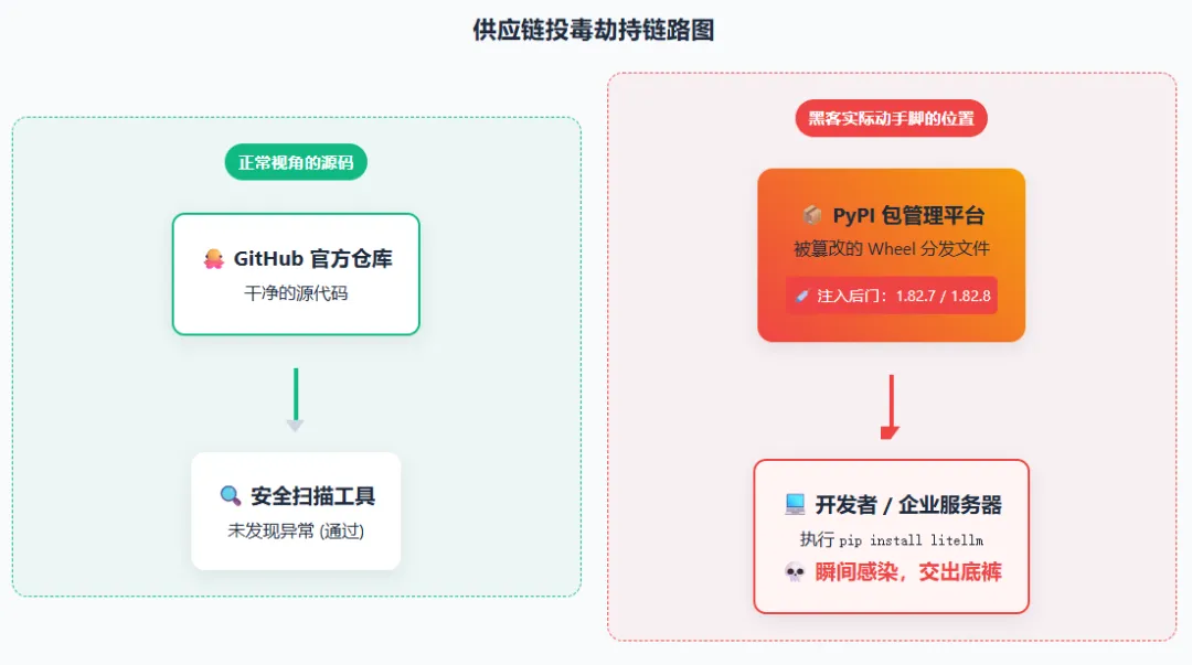然而,Endor Labs 发现,在 Python 官方包管理平台(PyPI)上发布的 litellm1.82.7 版本和 1.82.8 版本中,被悄悄塞进了恶意的后门代码。😱 最让人细思极恐的是,这些恶意代码在 GitHub 上的开源代码库里根本不存在!黑客是直接在打包上传到 PyPI 的最终分发文件(Wheel 文件)里动了手脚,完美绕过了所有针对源代码的常规安全审查。🕵️♂️
