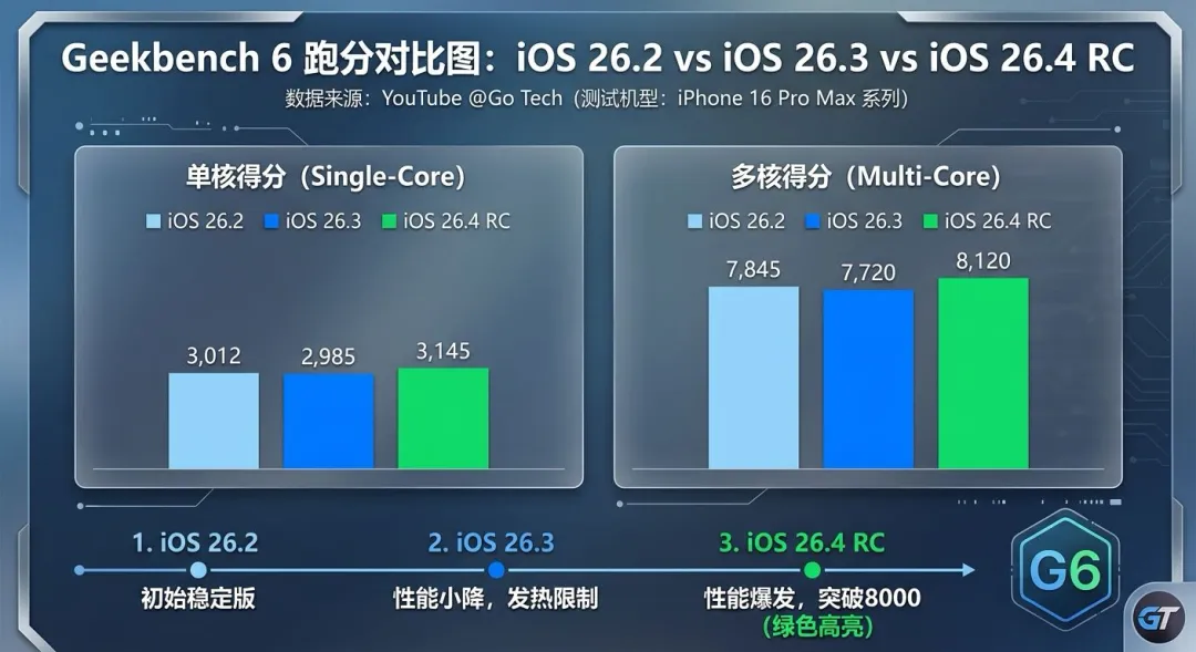 iOS 26.4 RC vs iOS 26.2/iOS 26.3:性能出现明显跃升。 第三方评测博主 Go Tech 在 YouTube 评测视频中明确指出,iOS 26.4 RC 版本的 Geekbench 6 分数比前两个版本有"significant jump"(显著跃升),尤其在多核负载下表现更稳定。