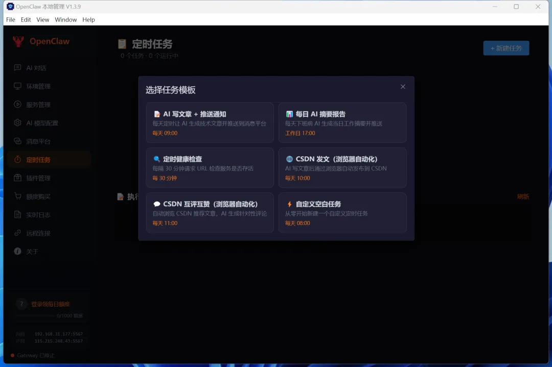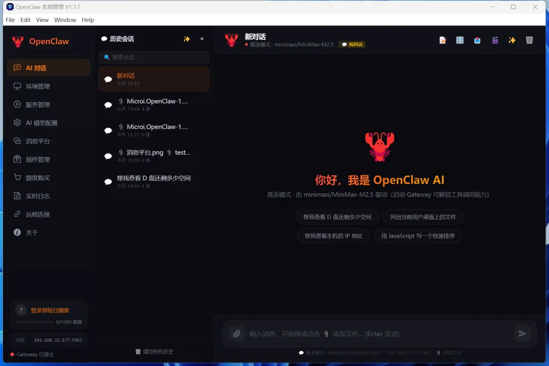 microi.openclaw/├── electron/ # Electron 主进程│ └── main.js # 桌面应用入口├── src/ # 前端 (Vue 3 + Element Plus)│ ├── main.js│ ├── App.vue # 根组件 (暗色主题)│ ├── router/index.js│ └── views/│ ├── Layout.vue # 侧边栏布局│ ├── Chat.vue # AI 对话│ ├── Home.vue # 主页│ ├── Environment.vue # 环境管理│ ├── Service.vue # 服务管理 (资源监控)│ ├── Config.vue # AI 模型配置│ ├── Plugins.vue # 插件管理│ ├── Tasks.vue # 定时任务│ ├── Skills.vue # 技能管理│ ├── Channels.vue # 消息平台│ ├── Logs.vue # 实时日志│ └── Remote.vue # 远程连接│├── server/ # 后端 (Express + WebSocket)│ ├── index.js # 服务入口│ ├── utils.js # 工具函数│ ├── app-config.js # 应用持久化配置│ ├── scheduler/ # 定时任务引擎│ │ ├── engine.js # Cron 调度 + 变量传递│ │ └── executors.js # 步骤执行器│ ├── services/ # 外部服务集成│ │ ├── feishu-poll.js # 飞书轮询服务│ │ └── feishu-ws.js # 飞书 WebSocket 长连接│ └── routes/│ ├── chat.js # AI 对话代理│ ├── env.js # 环境检测与安装│ ├── service.js # Gateway 启停│ ├── config.js # 配置读写│ ├── plugins.js # 插件管理│ ├── tasks.js # 定时任务 CRUD│ ├── skills.js # 技能管理│ ├── channels.js # 消息平台 (飞书)│ ├── logs.js # 日志读取│ ├── status.js # 系统状态│ └── remote.js # 远程连接│├── dist/ # 前端构建产物└── release/ # 安装包输出目录 └── Microi.OpenClaw Setup 1.0.0.exe项目效果