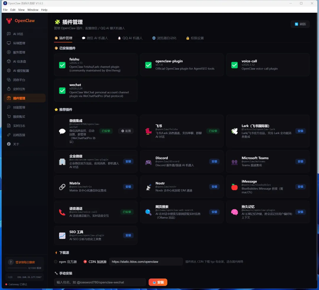 内置可视化插件市场,支持一键安装微信机器人、语音通话、Teams、Matrix 等插件,并提供 npm 和 CDN 双下载源保障安装成功率。