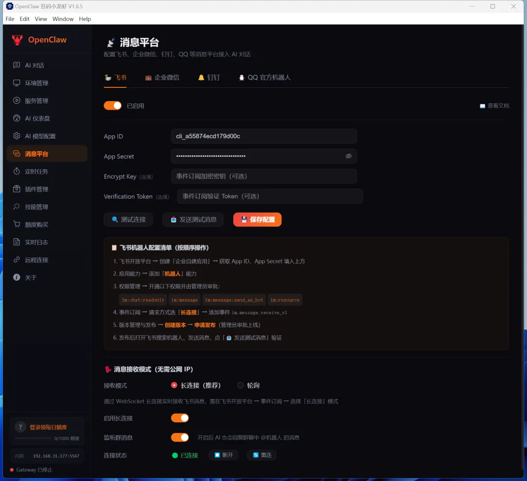 7、消息平台集成:深度集成飞书机器人,支持 WebSocket 长连接和轮询两种模式,可自动接收消息并交由 AI 进行回复。