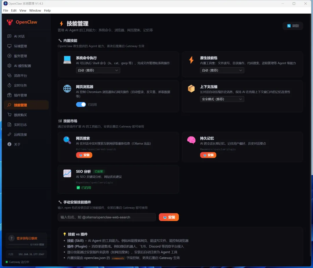 9、技能管理中心:管理 AI 内置技能(如命令执行、浏览器操作、上下文压缩)及可安装技能(如联网搜索、记忆、SEO),支持手动安装自定义技能包。