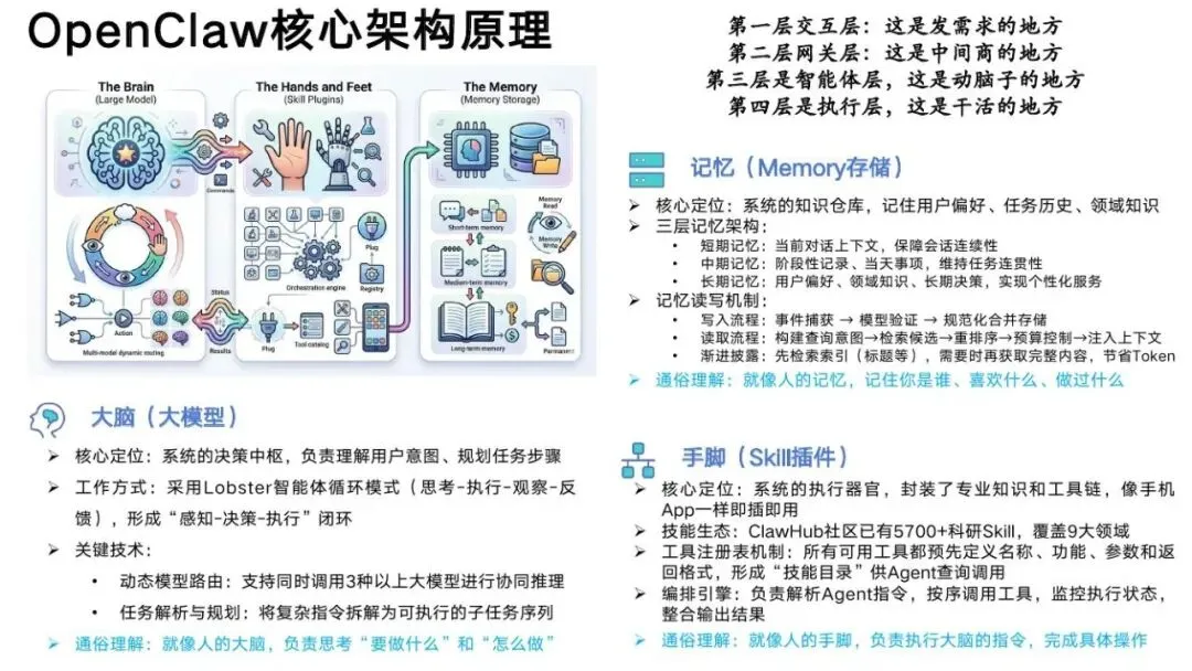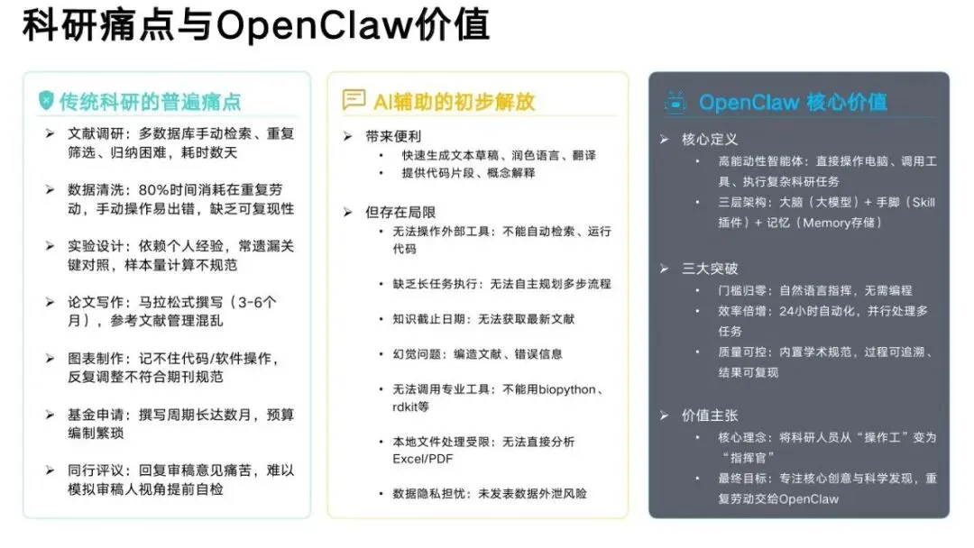 清华&北航:OpenClaw科研手册(附完整报告下载)清华&北航:OpenClaw科研手册(文末附完整报告pdf下载地址)报告系统介绍了OpenClaw这一高能动性科研智能体,通过“大脑+手脚+记忆”三层架构,将科研人员从重复劳动中解放为“指挥官”,实现文献综述、论文撰写、数据分析等全流程自动化,并提供了从部署到高阶拓展的完整实操指南。未完待续,请参考完整版报告完整报告请关注公众号(GIS极客)后台回复'清华&北航',获取下载链接。