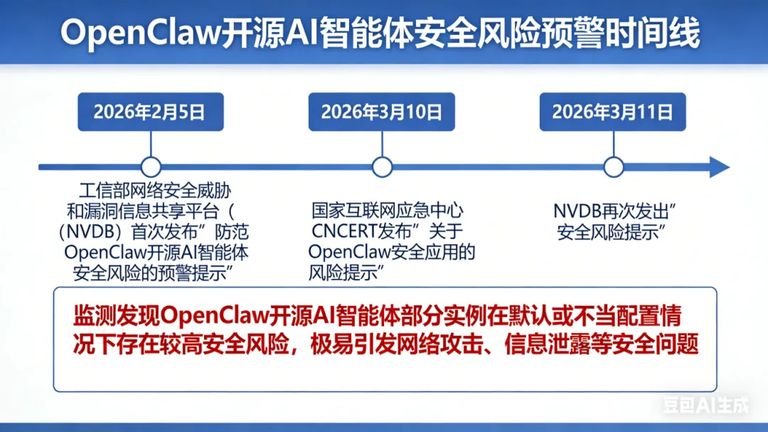 然而,狂欢之下,工信部网络安全威胁和漏洞信息共享平台(NVDB)于2026年2月5日首次发布关于防范OpenClaw开源AI智能体安全风险的预警提示,国家互联网应急中心CNCERT于3月10日发布关于OpenClaw安全应用的风险提示,NVDB于3月11日再次发出安全风险提示——监测发现OpenClaw开源AI智能体部分实例在默认或不当配置情况下存在较高安全风险,极易引发网络攻击、信息泄露等安全问题。