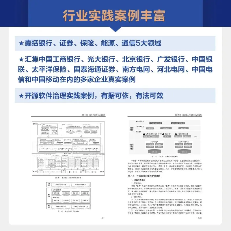 下篇:实践与案例(第11~15章) 汇集行业前沿实践成果。收集整理了银行、保险、证券、能源、通信运营领域的十余家知名企业在开源软件治理方面的心得和成果,包括中国工商银行、光大银行、北京银行、广发银行、中国银联、太平洋保险、国泰海通证券、兴业证券、南方电网、河北电网、中国电信、中国移动等。