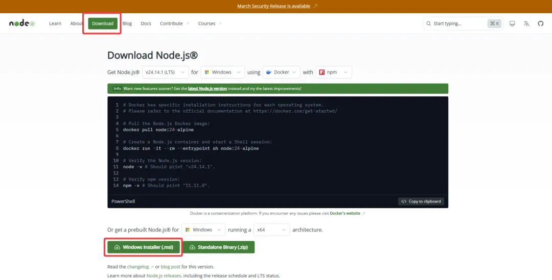 我们需要Node.js作为安装环境(>22),所以我们先去下载Node,浏览器输入网址:https://nodejs.org/en,选择Download,并在下方根据你的电脑系统进行下载,下载完成后,直接双击进行安装。进入安装程序后,全部选择下一步,不需要任何更改。