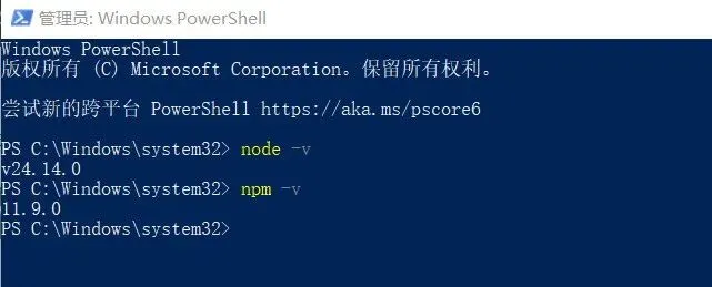 安装完成后,我们启动PowerShell,并以管理员身份运行进行OpenClaw安装,打开命令行后,首先需要检查一下之前的环境安装有没有成功: