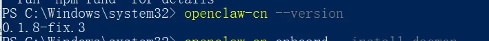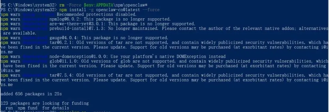 npm install -g openclaw-cn@latest当看到成功添加600多个package后,证明此步成功。同时会看到很多警告,不用管,不影响运行