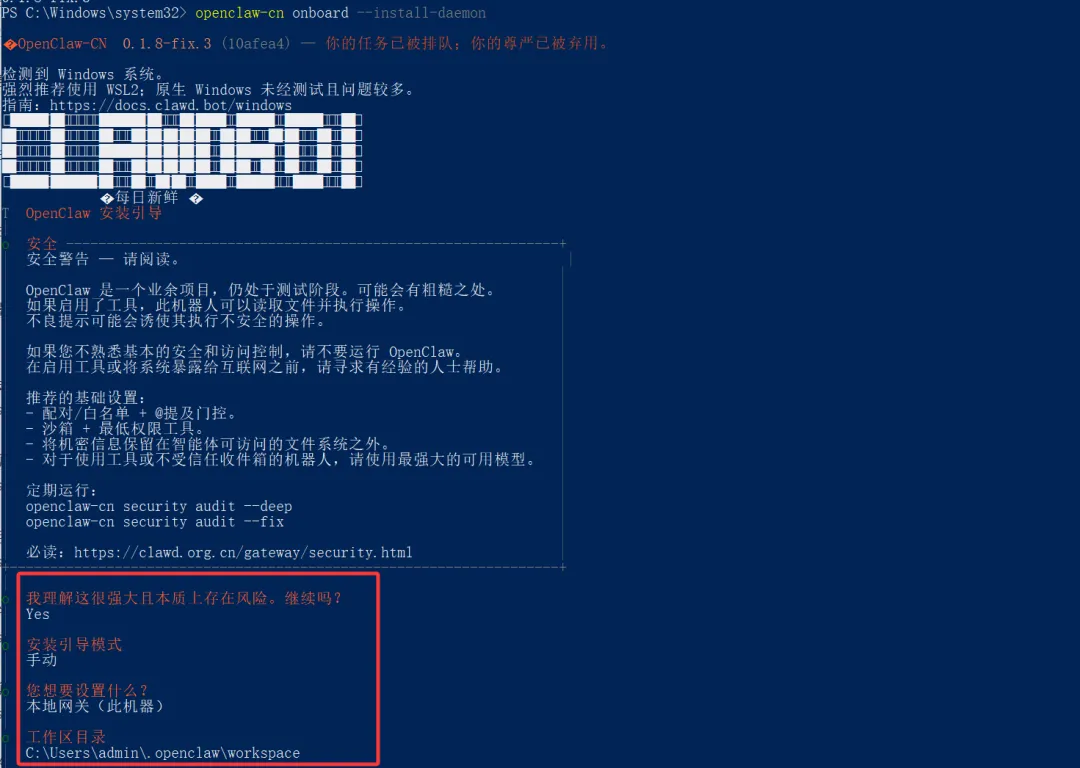 openclaw-cn onboard --install-daemon选择YES并回车,接着选择手动配置并回车,接着选择本地网关并回车,工作区目录默认在C盘,提示:这里的选择是用键盘的“⬆ ⬇ ⬅ ➡”进行选择