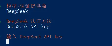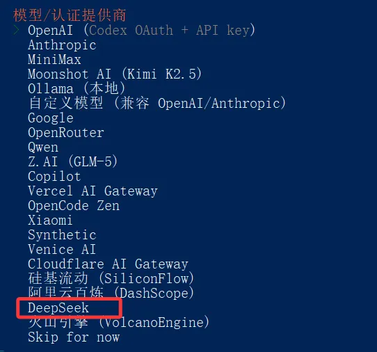 接下来,需要选择模型/认证提供商。这里推荐大家用deepseek,因为deepseek配置简单并且token便宜,对新手很友好