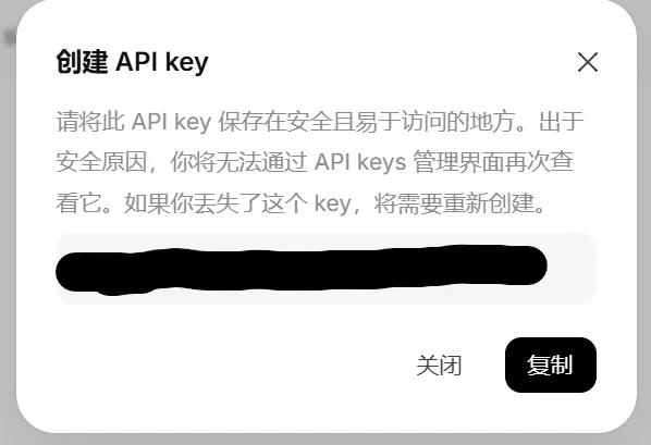 名称可以随便填写,接着会弹出来一串密钥,点击“复制”,并粘贴到刚才的命令行中。这里注意!!!建议大家把密钥同时保存到一个靠谱的地方,因为这个对话框一旦关闭,就无法再查看密钥的具体内容了,并且一定注意不要把密钥泄露出去,否则别人可以用你的deepseek额度。