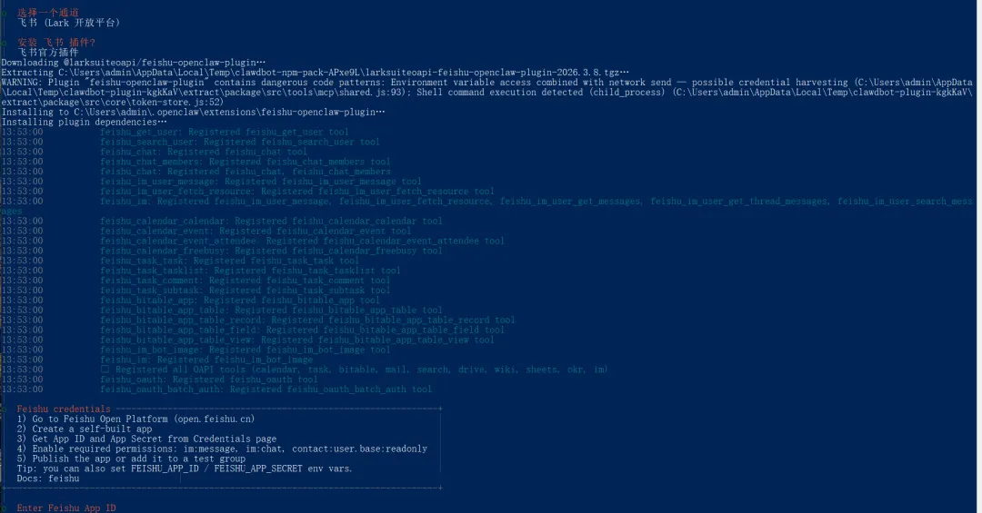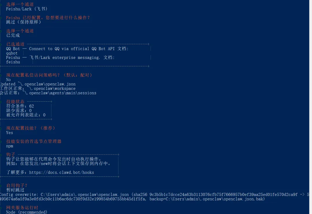 接着需要输入App Secret,把刚才飞书页面的App Secret再复制粘贴到命令行中并回车 通道选择已完成,接着选择YES,节点管理器选择npm;接着选择暂时跳过,注意先按空格,再按回车;下面的网关服务运行时选择Node,也就是直接回车