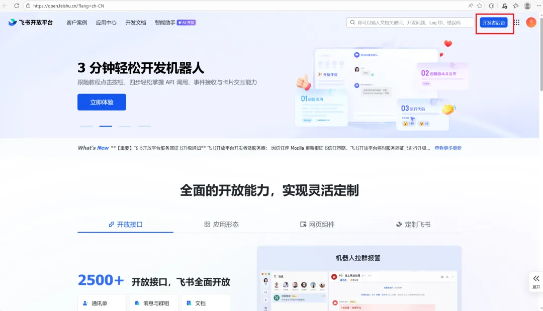 接下来需要输入飞书的App ID,我们需要登录飞书的官方网站,浏览器输入搜索“飞书开放平台”,或者直接输入网址:https://open.feishu.cn/?lang=zh-CN