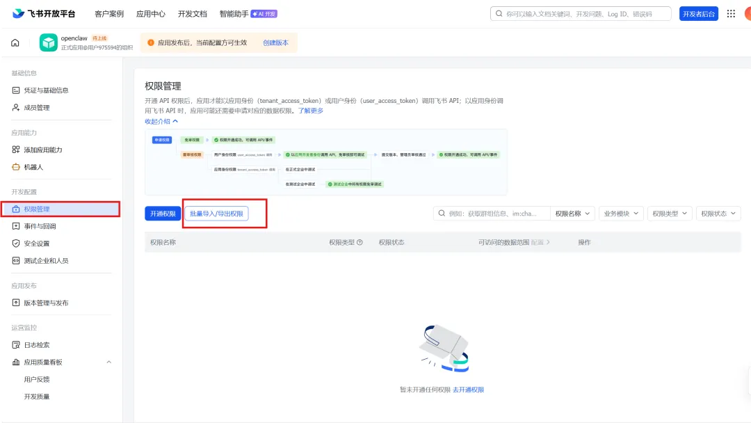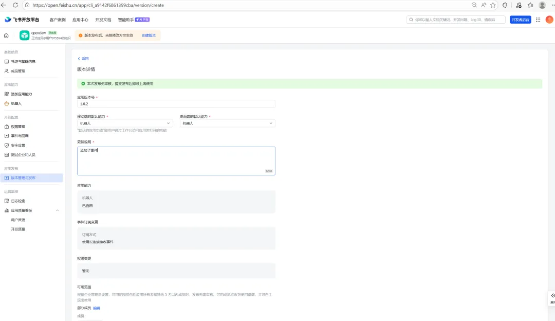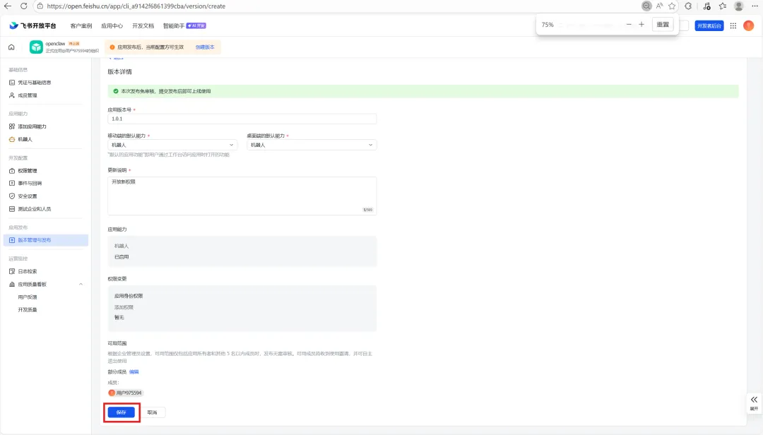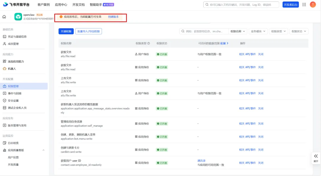 应用版本号、更新说明也都是自己随意填写就可以,填写完成后,选择页面下方的保存,并申请发布(如果你用的是企业版的飞书,可能还要在手机上做一个验证,按照飞书发来的短信进行验证即可)。发布后,回到权限管理,可以看到权限都变成了开通状态