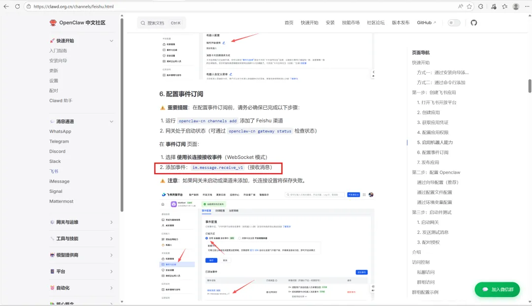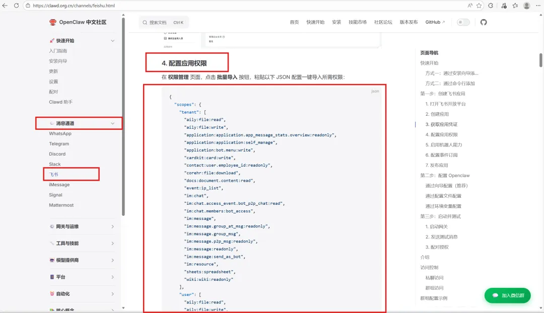 我们回到OpenClaw中文社区( https://clawd.org.cn/start/getting-started),左侧找到消息通道,选择飞书,向下拉,找到 4.配置应用权限,将下面的文本复制并粘贴到刚才的权限文本中