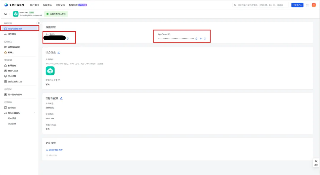 接着在页面左侧进入凭证与基础信息,App ID和App Secret都在这里,首先复制App ID并粘贴到Powershell命令行中并回车