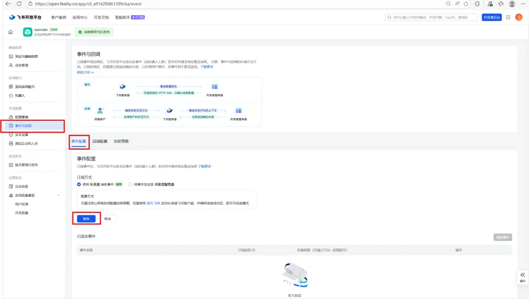 回到飞书开放平台,在页面左侧找到事件与回调,选择订阅方式,保存长链接