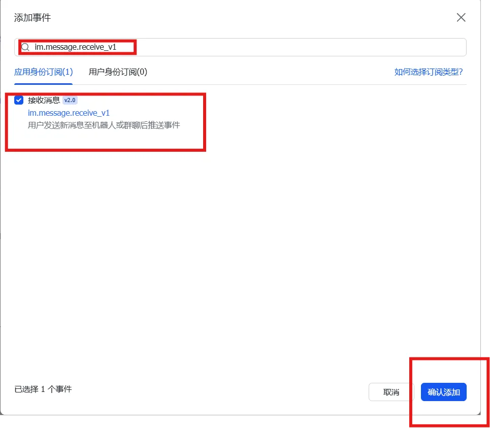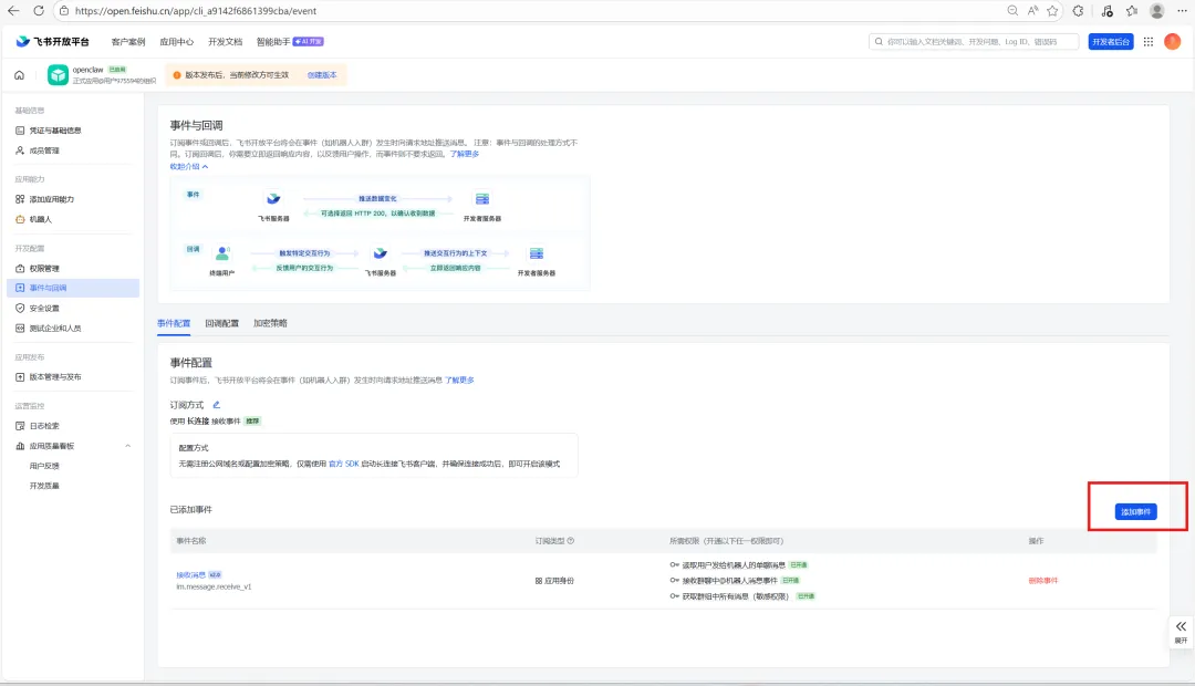 先不要发布。选择添加事件,接着回到OpenClaw中文社区,还是在刚才配置权限的页面找到 6.配置事件订阅,并把事件复制粘贴到刚才的飞书平台添加事件的搜索框中,勾选接收消息,点击确认添加