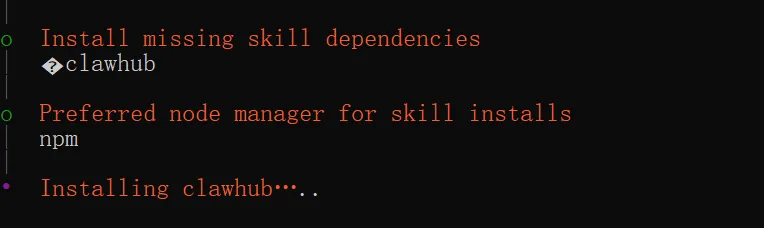 在技能列表中,我们暂时只勾选这个 clawhub,这样会帮我们安装 clawhub 命令,clawhub 是后期用来安装技能要用的命令。这里要注意方向键选择之后,还要按空格键确认,左边显示+号才表示选中了,再按空格键盘表示取消勾选。