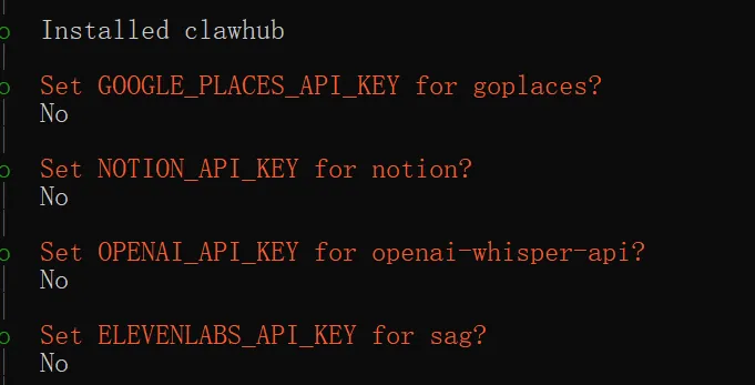 clawhub 安装好以后,接下来的几个 key 可以都选择 No,这些国外的 apiKey 本身我们也没有,后期有需要的话都可以通过技能使用国内对应的服务。