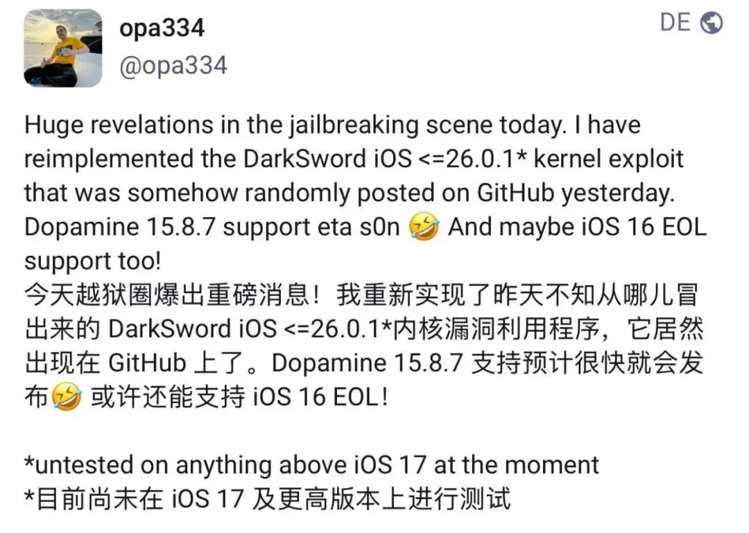 实现了 DarkSword iOS ≤26.0.1* 内核漏洞利用;iOS 15.8.7 的越狱即将到来,甚至可能还会支持 iOS 16 通杀???iOS17可能也有戏????