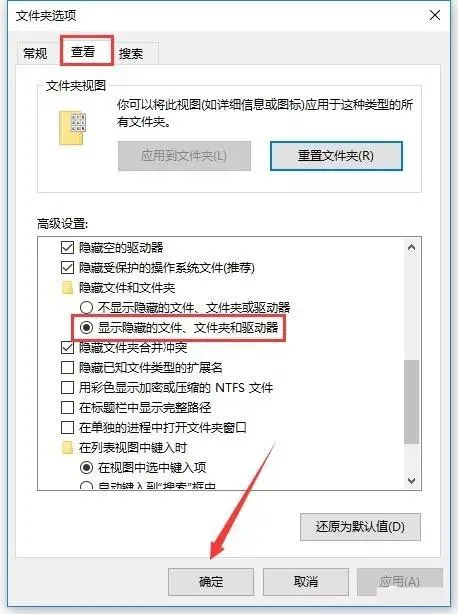 2)切换查看页面,选择显示隐藏的文件、文件夹和驱动器,点击确定。