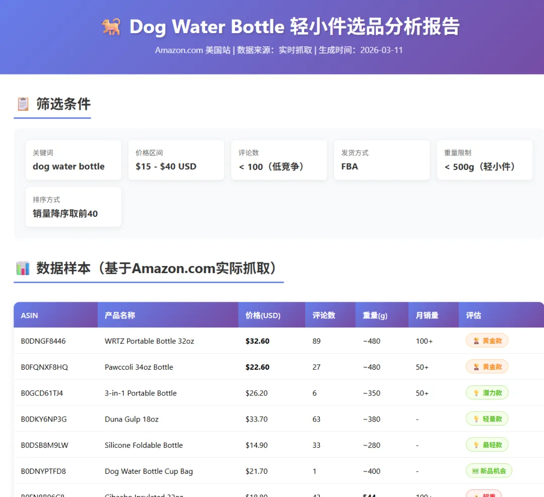 这次我还是沿用上个月文章里的老对手:宠物水杯(dog water bottle)这个单品,跑了三个核心场景。