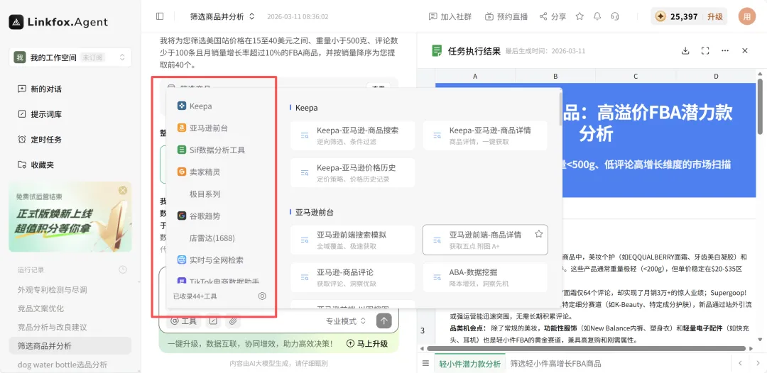 这两周我一直在高强度测一个叫 LinkFoxAgent 的东西。它背后接了 40+ 个行业工具的底层接口,包括 Keepa、SIF、卖家精灵、极目、智慧芽、ABA 数据、EchoTik、谷歌趋势、1688 店雷达,还有专利检索工具智慧芽和睿观。
