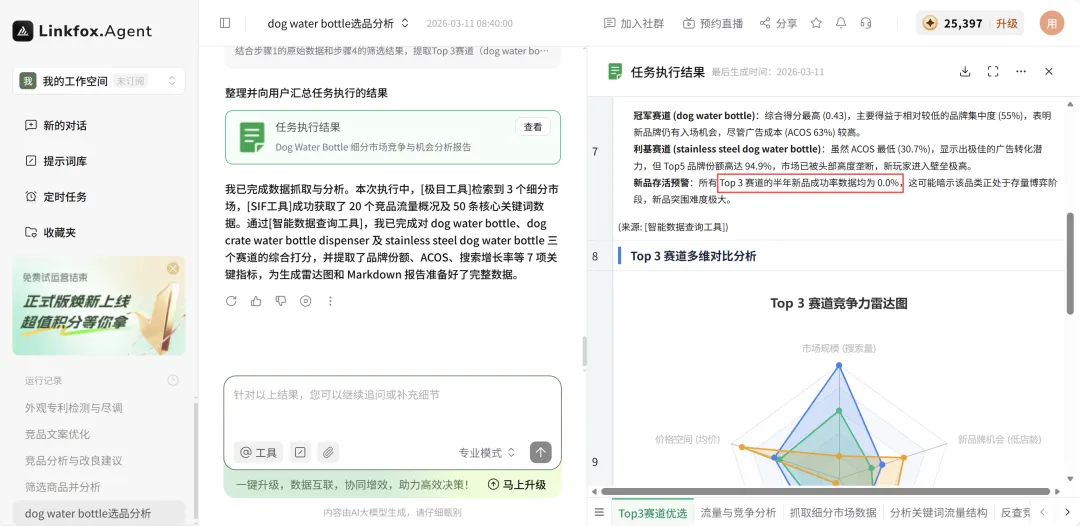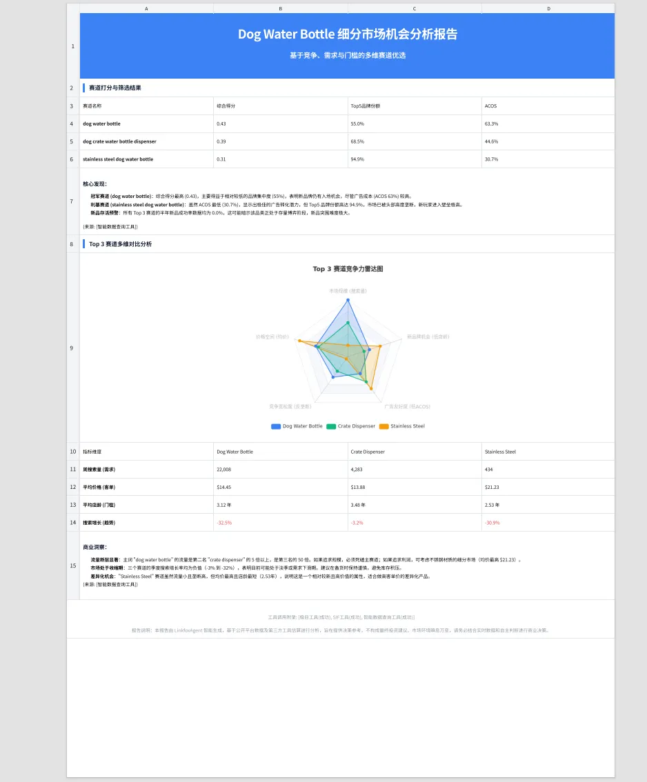 我给 LinkFoxAgent 扔了一句话:分析宠物水杯主赛道的竞争格局,拉出点击占比和 SP 广告占比,画竞争雷达图。