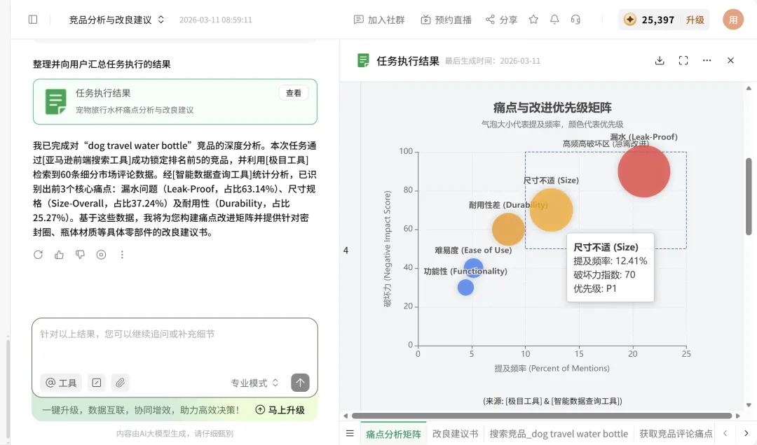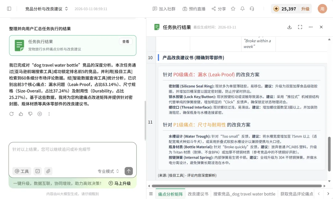 我让 LinkFoxAgent 调用极目工具把 Top 3 竞品的低星差评全量抓下来,做优先级,并给出改良建议。