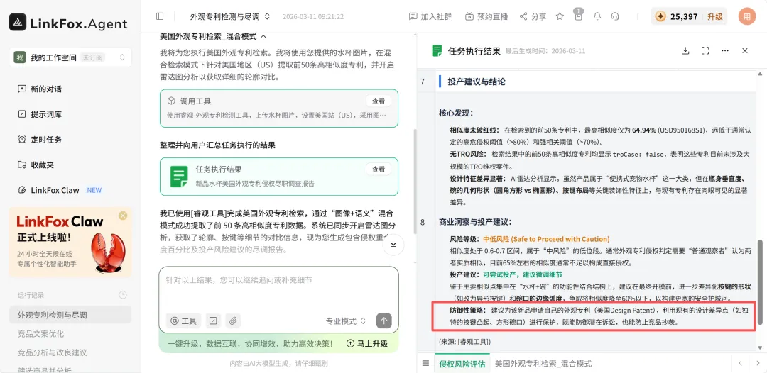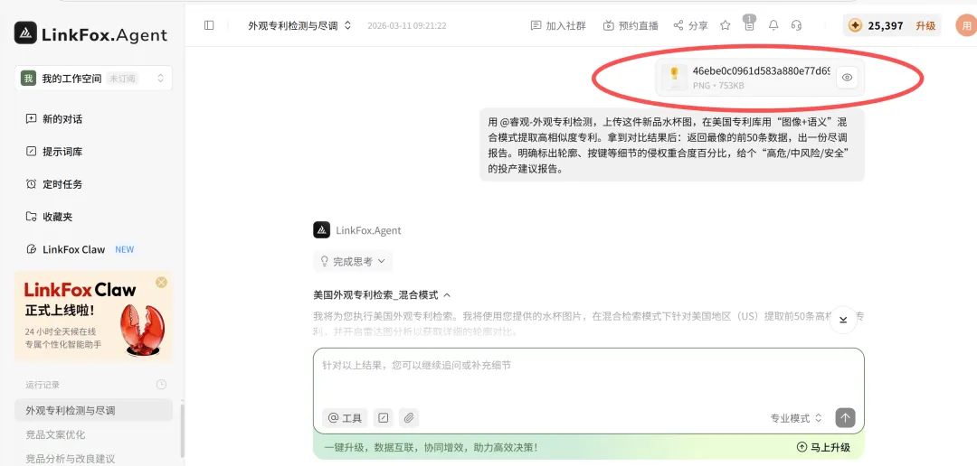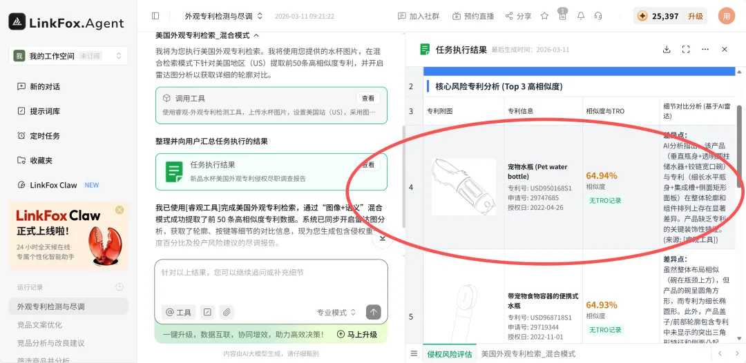 我直接把宠物水杯的设计图上传,让 LinkFoxAgent 在美国专利库做图像加语义的混合检索,出具尽调报告。