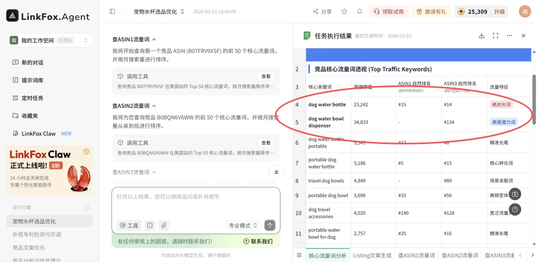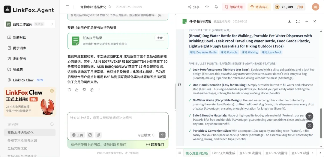 先说文案。我把三个标杆竞品的 ASIN 扔给 LinkFoxAgent,让它反查 Top 50 核心流量词,结合 VOC 痛点,用 BAF 法则直接出标题和五点描述。