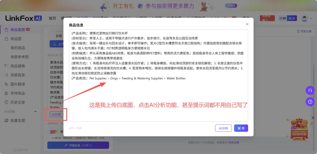 所以我的做法变成了:把产品白底图丢进去,点左下角 AI 分析,它自动读取产品信息,把名称、目标受众、卖点、材质、使用场景全部跑出来,我一个字没写。
