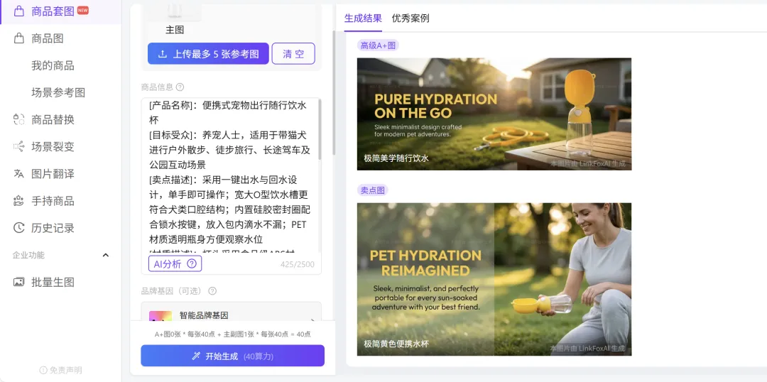 然后直接点开始生成,高级 A+ 图、卖点图、主图套图一并出来,整套风格统一,不会每张调性不一样。