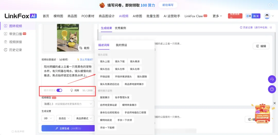 不需要你自己写复杂提示词,系统还内置了描述词库和提示词优化,可以一键调用。