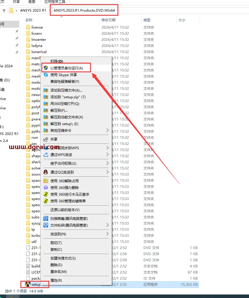 2、打开【ANSYS.2023.R1.Products.DVD.Win64】文件夹,选择setup安装程序鼠标右键以管理员身份运行
