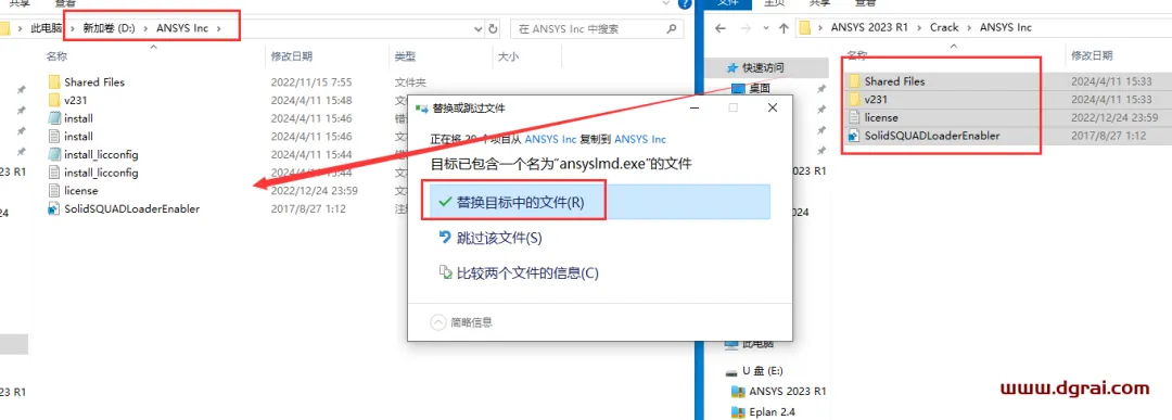 13、打开授权管理安装目录(步骤6更改的位置),然后将安装包Crack-ANSYS Inc文件夹里面的所有文件全部复制过去,替换完成即可