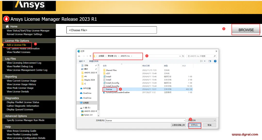 17、点击【Add a License File】-【BROWSE】,弹出对话框,找到软件安装目录里面的license文本打开