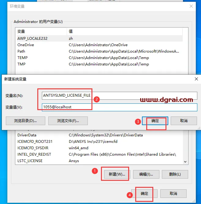 36、新建环境变量:输入变量名:ANTSYSLMD_LICENSE_FILE 输入变量值:1055@localhost 点击【确定】-【确定】