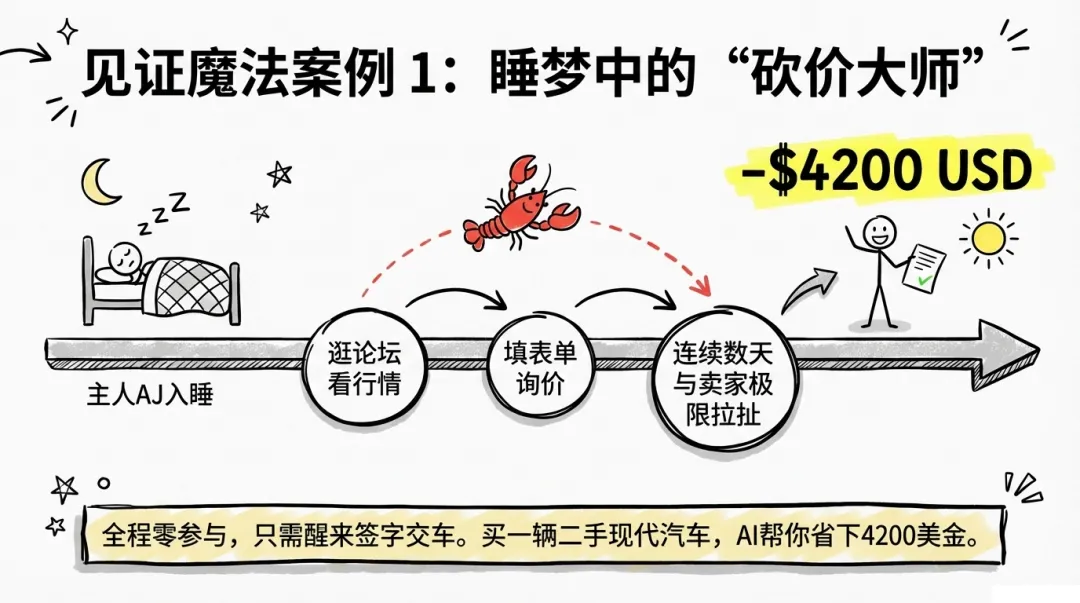 他只给OpenClaw下了一个指令。结果这只“龙虾”自己去论坛看行情、去车行填表、甚至花了好几天跟卖家讨价还价,最后竟然砍掉了4200美金!