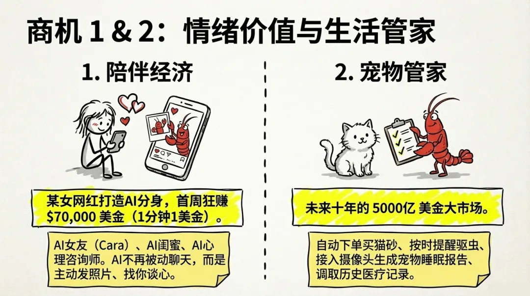陪伴经济:有人用它做AI女友,一分钟收一美金,一周赚了7万多美金。你也可以开发AI闺蜜、AI健身教练,关键在于它会主动找你聊天,这种情绪价值是巨大的。