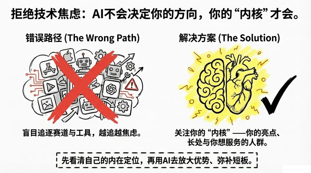 很多人问我:AI迭代这么快,我会不会被淘汰? 其实,真正决定你方向的不是AI,而是你的内心内核。你要学会的是如何把一项复杂工作拆解成流程,然后交给AI去执行。