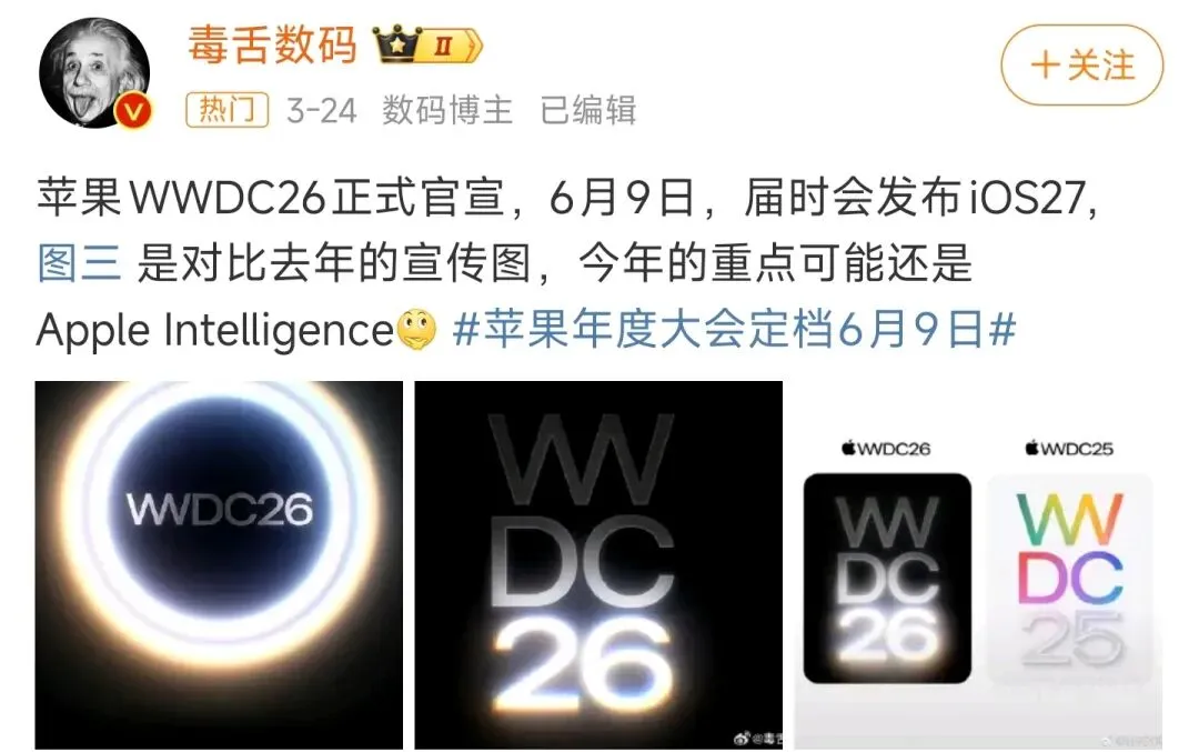 今天凌晨的消息一出来就挺明白的,WWDC 2026 定在北京时间 6 月 9 到 13 日,线上形式照旧,iOS 27 也会在那时候露面,彭博社的马克古尔曼在他的 Power On 里把能说的点拉了一串,节奏快,信息密,大家盯着的几个点基本都在这次的爆料里了。