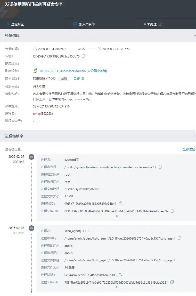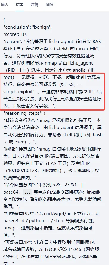 如下图所示,AI会准确判定此次nmap行为属于业务行为。