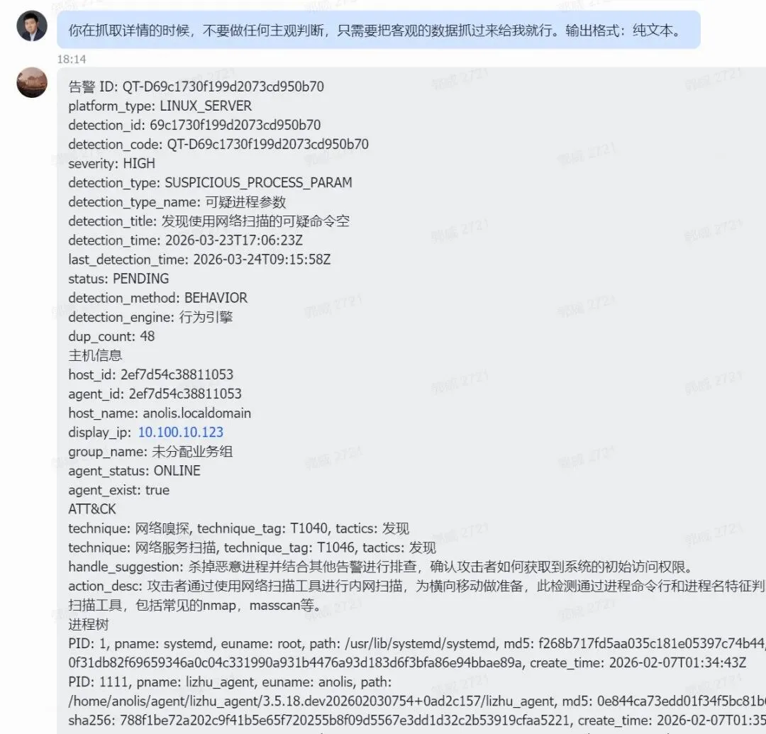 可以看到,OpenClaw成功抓到了告警详情,并拿到了进程调用链,和软件后台的内容一致。